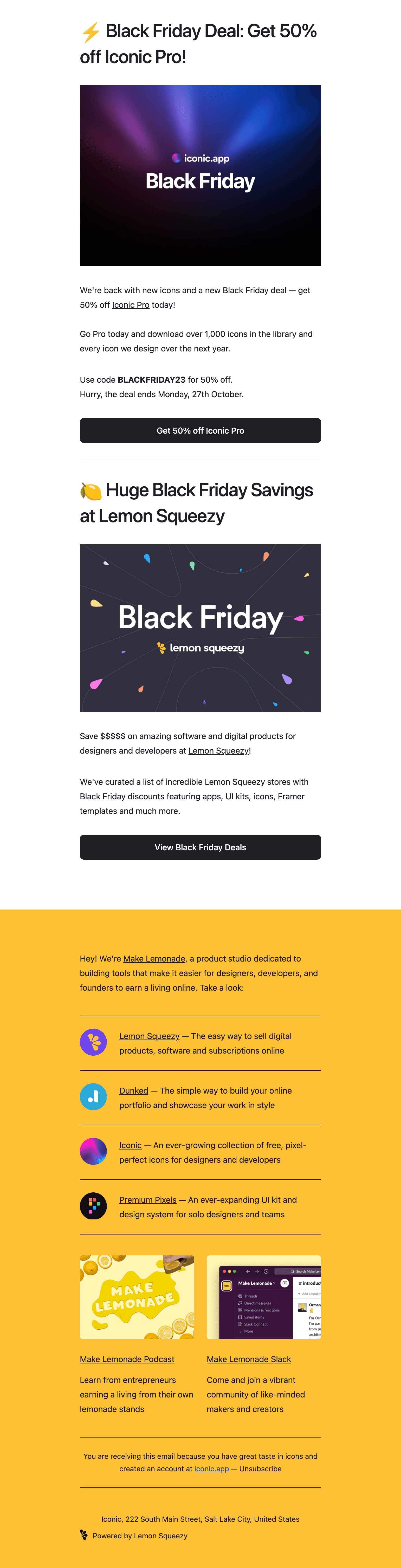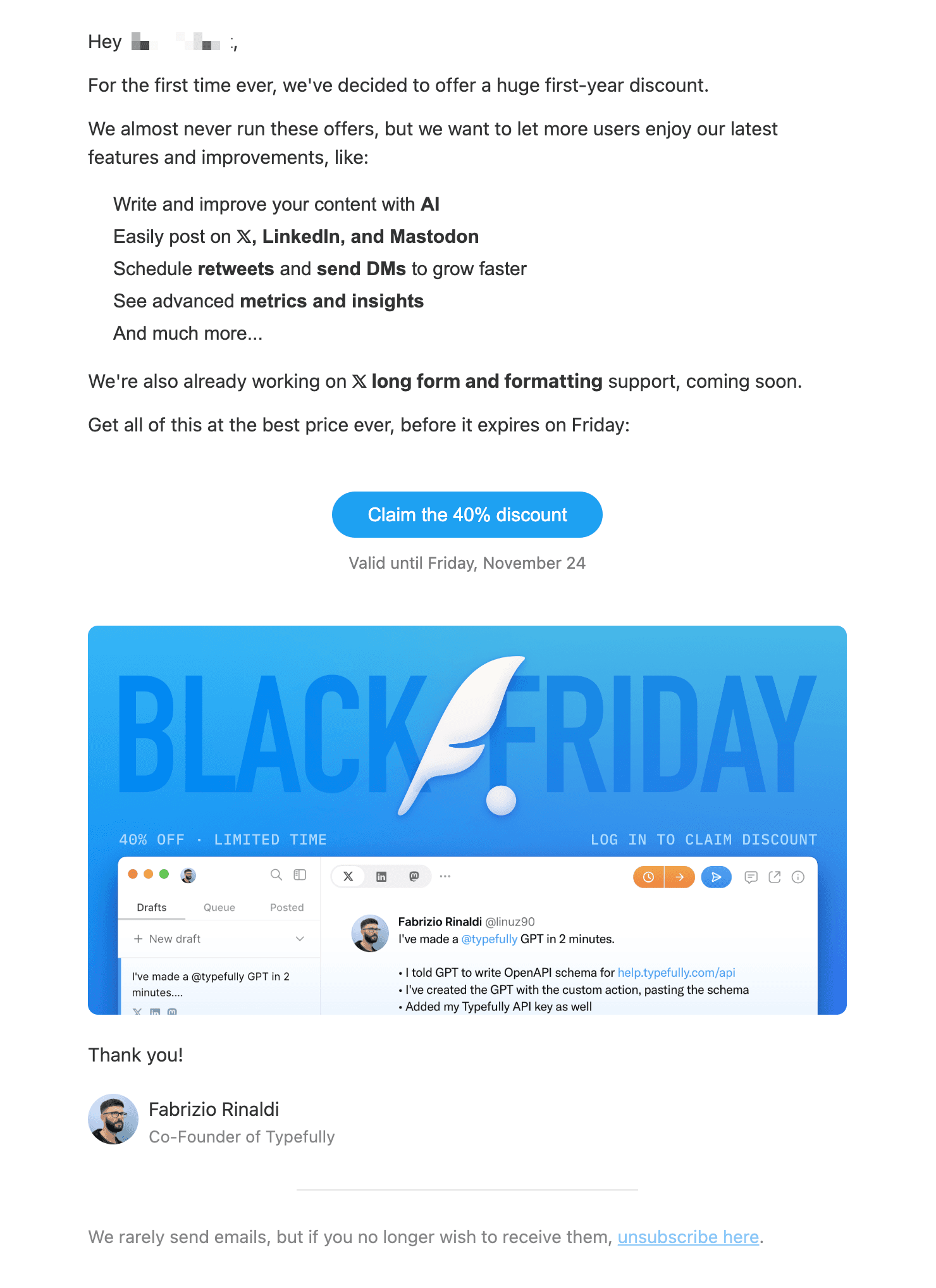 Typefully keeps their Black Friday email short and concise. They briefly highlight their recent product updates that you might have missed and immediately follow it with a generous discount. The email is wrapped up with an appealing image that was created just for this email.