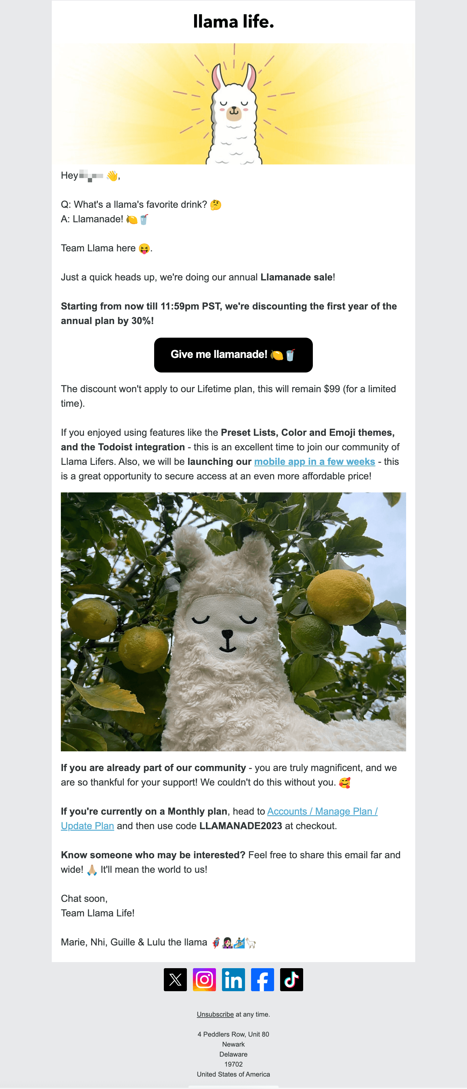 Llama Life proved that that you can have some fun and add some personality to your emails — even when asking for money. They also tease at an upcoming feature release while encouraging you to secure this discounted price ahead of time.