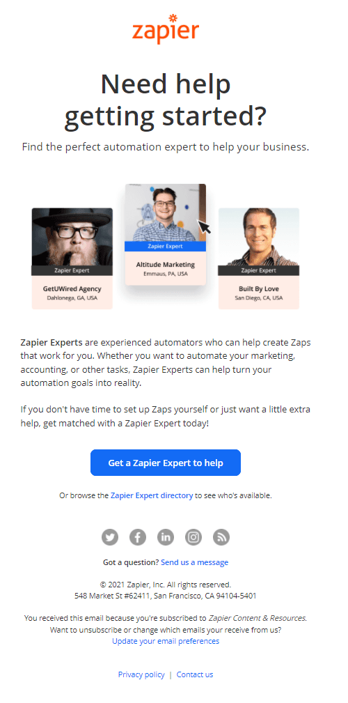 Zapier knows that setting up workflow automations may seem daunting to a new user. This onboarding email has one call to action... "Get a Zapier expert to help". This allows a new user to connect 1:1 with another user who is actually able to help set up your first automations for you. Genius.