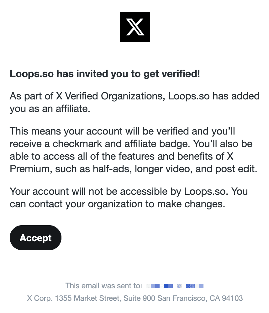 X (fka Twitter) makes becoming a verified affiliate of your company's brand account quick and easy. After briefly explaining what perks come with being an affiliate they clearly state that this does not give your company/organization access to your account. This gives the recipient confidence to hit "Accept" without many reservations.