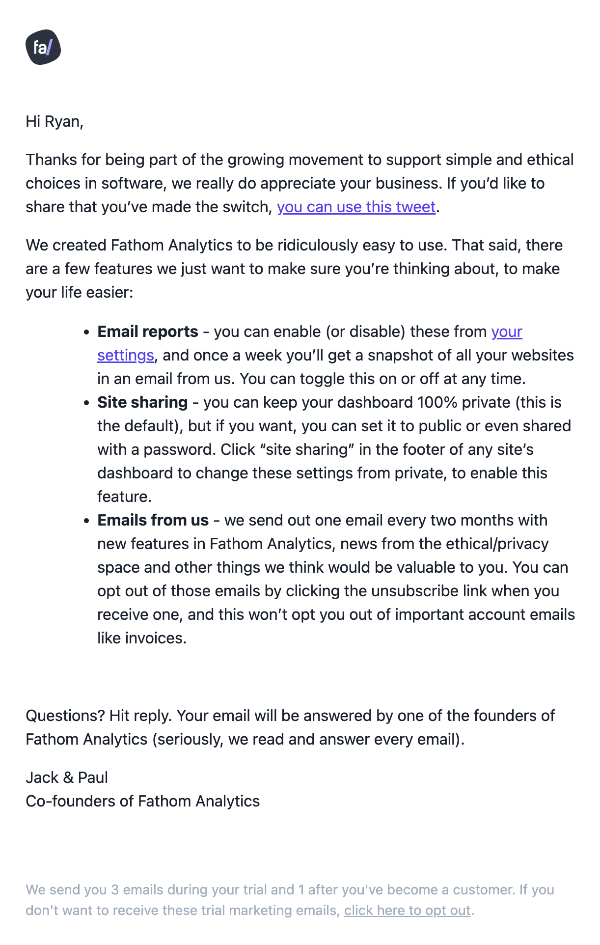 Fathom Analytics does a nice job of clearly setting expectations with their onboarding email. They start by reminding the user of why they may have signed up (they are a privacy focused ethical alternative to some of the biggest competitors). They are then sure to highlight 2 main features of their product so that there's no chance you miss them. They also do a great job of letting you know exactly how often you can expect to receive future emails from them, establishing trust that they will only be contacting you with useful information.