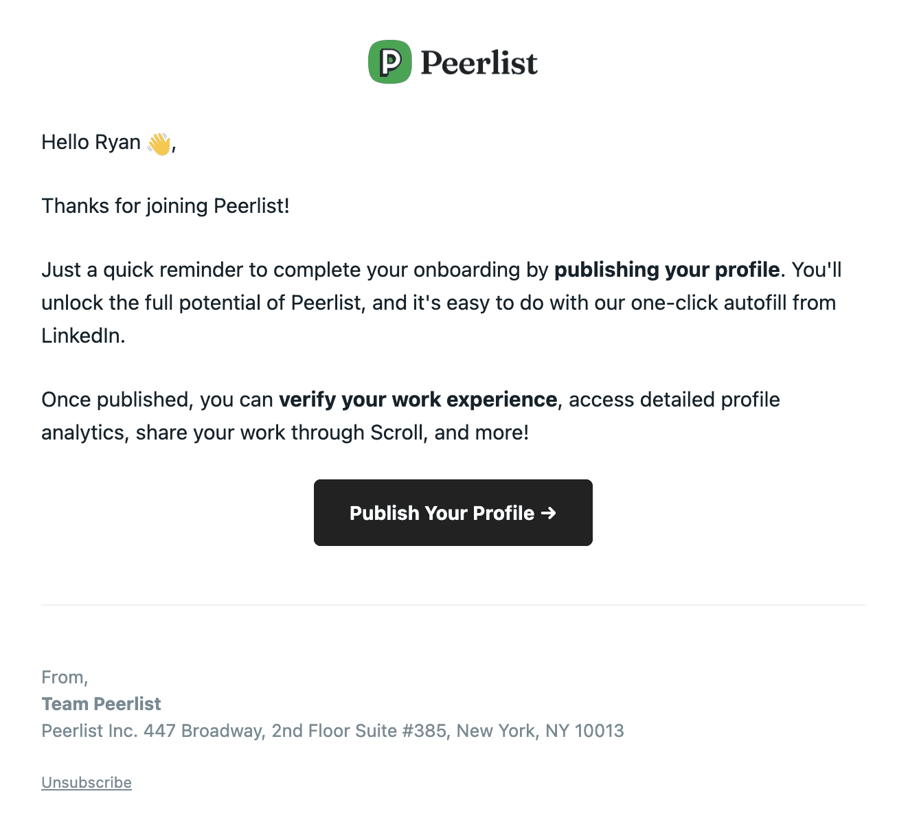 Peerlist sends an onboarding email to nudge new users to publicly publish their profile. They let you know that once you officially publish your page, you will be able to verify your work experience and share your page. That's the main goal of this onboarding email. Peerlist knows that a private and unfinished page isn't as valuable as a completed page that a user will willingly share around the internet for them. They're hoping that this direct email will be the final nudge needed to get users over the final hurdle.