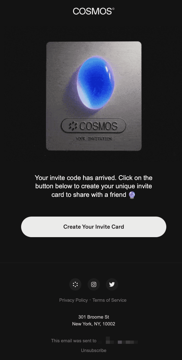 A few days after downloading the app, Cosmos sends you an onboarding email that prompts you to invite a friend. The email has a unique "invite card" that you are able to share. They are hoping that 1) you invite others to the app and 2) that you share the invite card to help build hype.