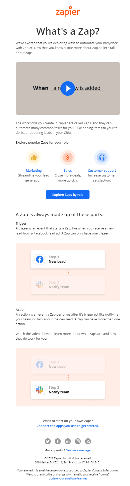 Zapier begins onboarding new users by sending an email that defines a Zap, the key to automating workflows with the service. They add visual aids that help a new user understand this in very few words. This email also does a great job of allowing users to view popular Zaps by job role so that they can see how other users take advantage of the automations.