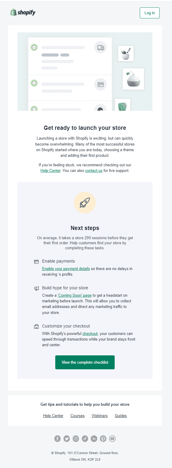 Shopify begins their onboarding email sequence with a quick checklist to ensure that your store is up and running (and able to accept payments) ASAP. They do a great job of letting the new user know that even the most successful Shopify stores started out at this stage and that the checklist is a great first step towards making the first sale.