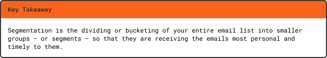 Segmentation is the dividing or bucketing of your entire email list into smaller groups — or segments — so that they are receiving the emails most personal and timely to them.