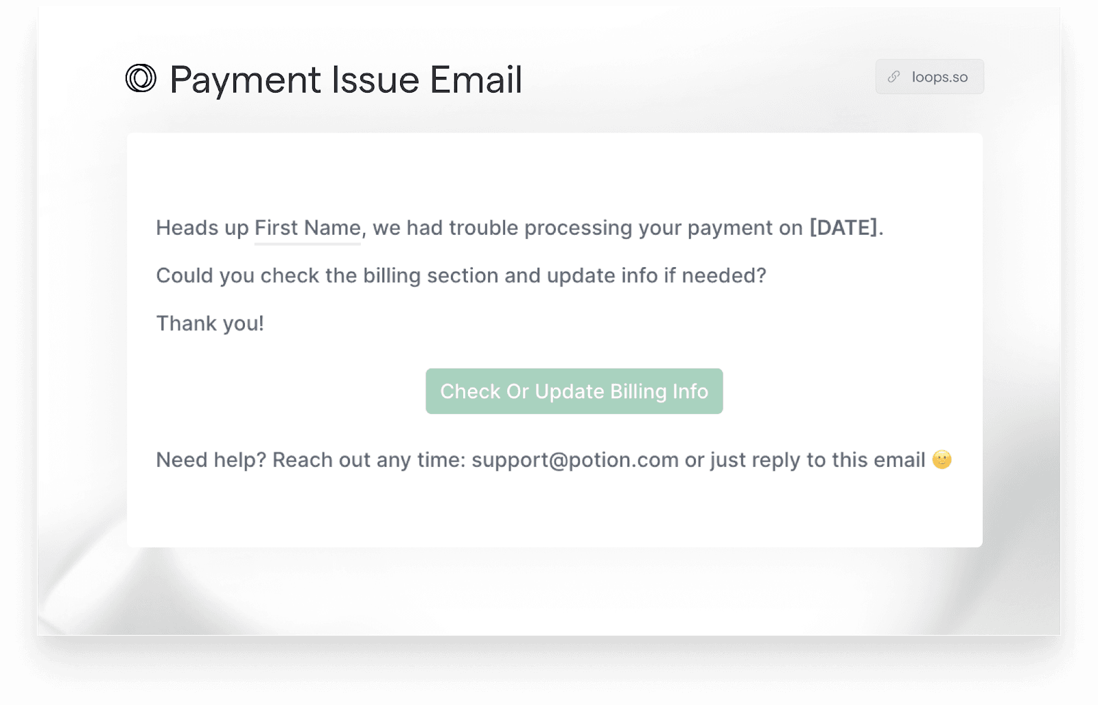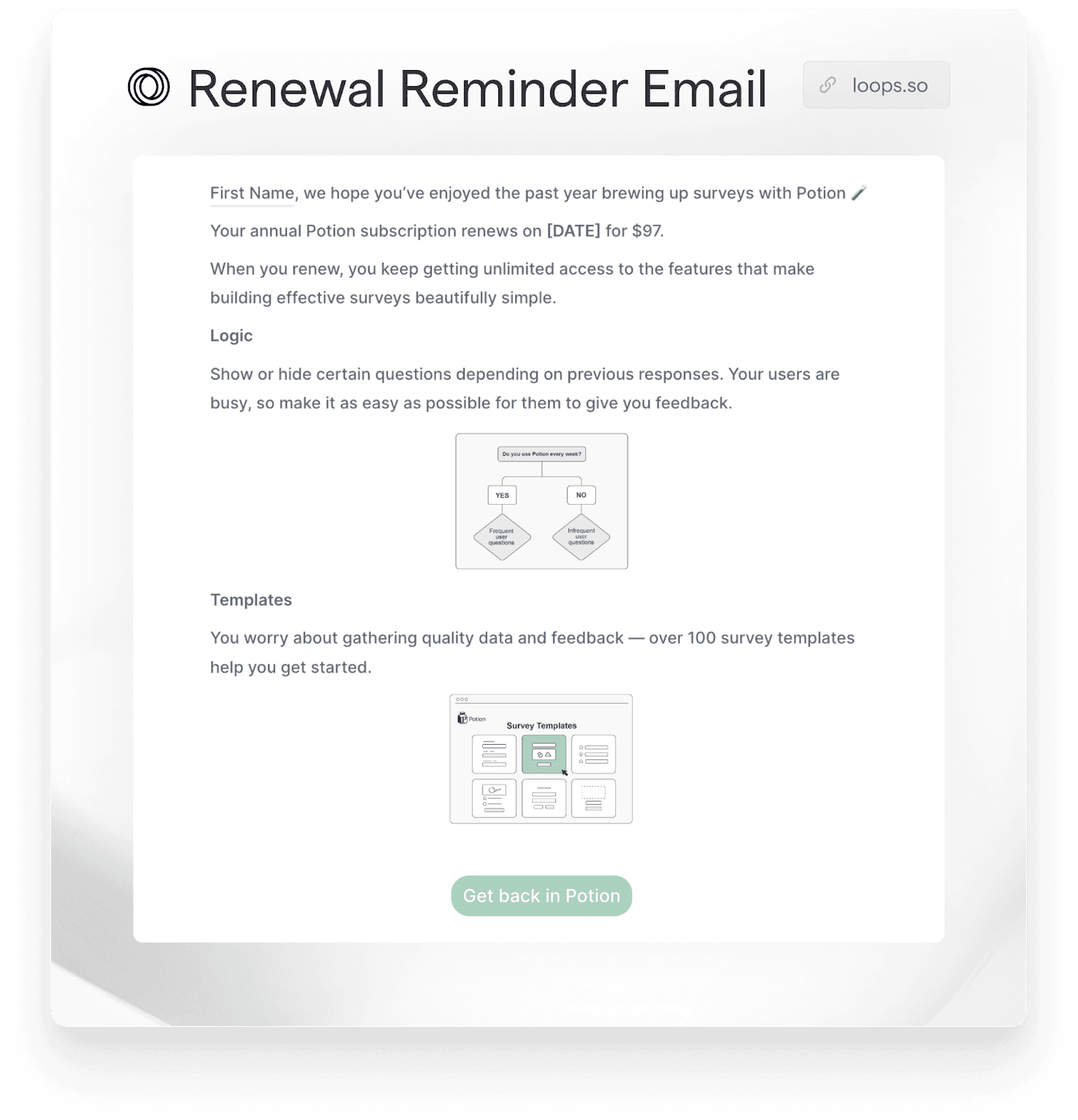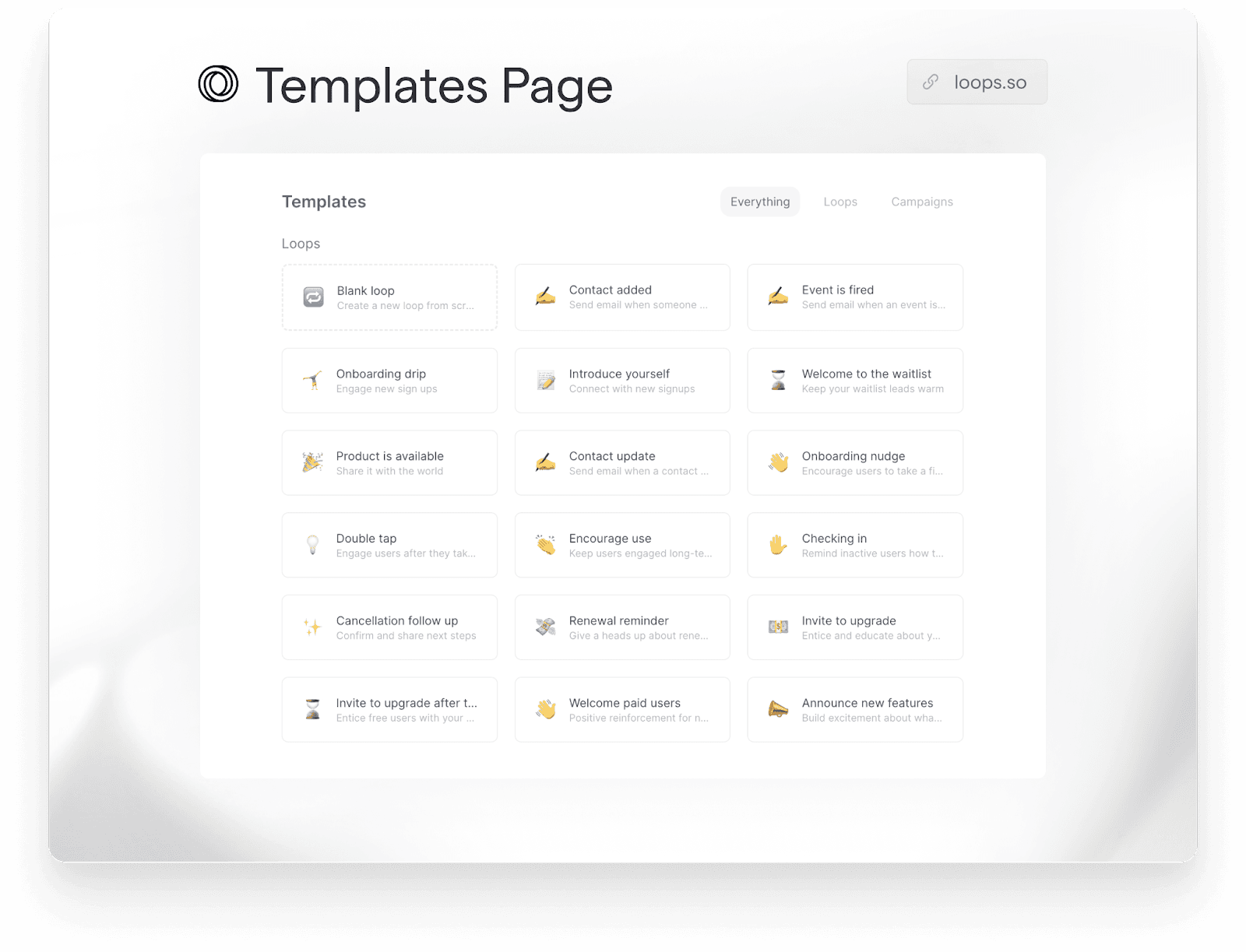 At Loops, we have ready-to-go (and proven to work!) templates for you to integrate throughout your SaaS email flow to ensure that your customers are always up to date and using your product as intended.